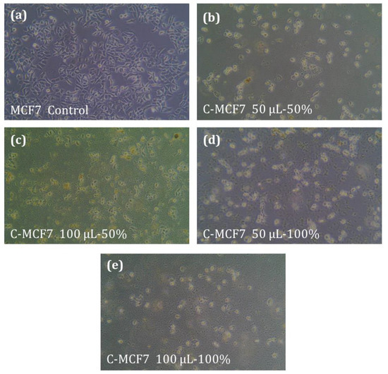 Effect of plant extract on MCF7 cancer cell lines. (a) The control samples (DMSO); (b) 50 μL of 50% extract; (c) 100 μL of 50% extract; (d) 50 μL of 100% extract; (e) 100 μL of 100% extract. The figures are at magnification 400×.