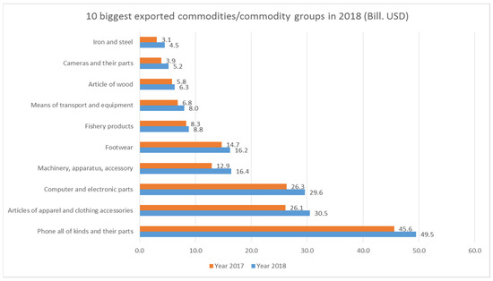 The textile industry involves the manufacturing of clothing and garments, embroidery, and the design, production, and distribution of yarns and fabrics. Vietnam’s textile and garment enterprises make an important contribution to the country, with the second largest export turnover in 2018, as shown in Figure 1 [1,2].