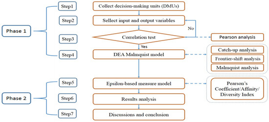 In this study, the DEA–Malmquist and EBM models were used to evaluate the efficiency of 10 Vietnamese textile and garment enterprises from 2017 to 2020. As shown in Figure 3, the research process could be divided into two phases. In the first phase, the DEA–Malmquist model was used to productivity index analysis to evaluate total productivity changes resulting from technical efficiency change (catch-up) and technological efficiency change (frontier-shift) with inputs (total assets, cost of goods sold, and liabilities) and outputs (total revenue and gross profit). Before applying the DEA–Malmquist model, Pearson correlation was used to evaluate the correlation between input and output variables. In the second phase, the EBM model was used to calculate the efficiency and inefficiency score of DMUs. Before using the EBM model, the diversity and affinity coefficient indices were verified.