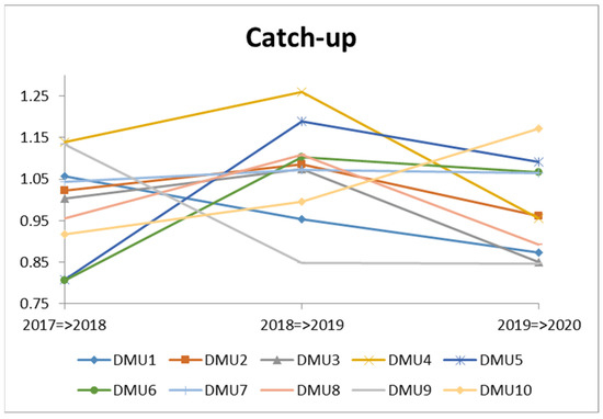 The Malmquist productivity index (MPI) [22] is the product of the change in technological progress and the change in technical efficiency. MPI can be calculated using the multiplying technical efficiency change (catch-up index) and technological change (frontier-shift index) [25].