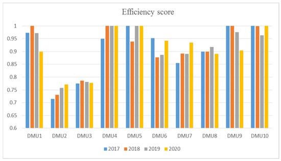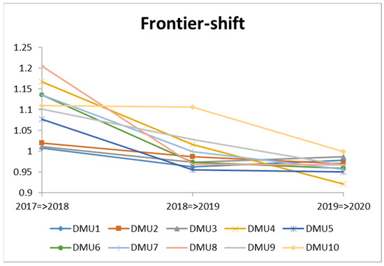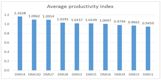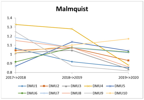 The average Malmquist indices of decision-making units (DMUs) for the period 2017–2020.