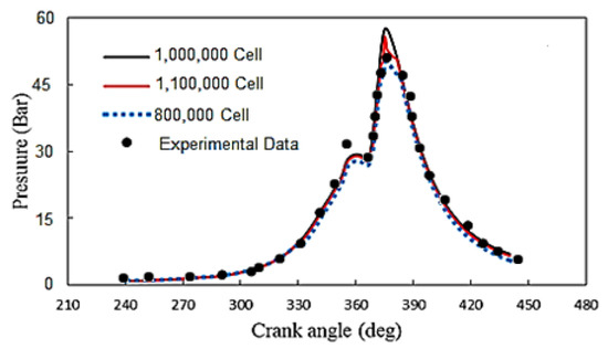 Appropriate cell modeling simulations were performed several times. Initially, the model entered the dissolved cycle with 800,000 cells (average size per cell 22 mm) and combustion pressure values were considered as output. By reducing the average cell size, the amount of space produced up to 1 million cells and reported improved output results. With the increase of cells to 1.1 million cells, the output results of combustion pressure diverged and went out of the optimal state. Therefore, the best network used in this study had 1 million cells. To validate the simulation, a comparison was made between the laboratory results and the computer model. There is always a numerical gap between the modeling results and the laboratory results, which should be reported as an error between the laboratory results and the computer modeling. In the study, due to the use of two different speeds, it is necessary to validate the simulation conditions with laboratory results in two rounds. In most studies, the combustion pressure parameter is used to validate the models. Comparison of simulation and laboratory results showed that the percentage of error between laboratory results and simulation results is about 6%. Therefore, the outputs of the simulation model are in good compliance with the laboratory results [45]. Figure 4 shows the results of laboratory validation and simulation. The results show 100% in the conditions of using natural gas.