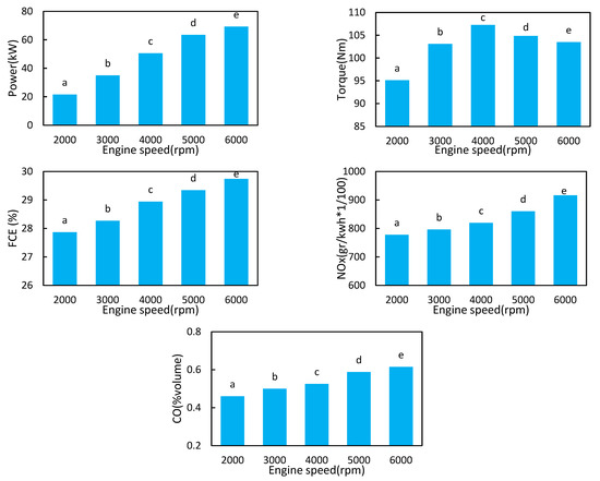 Figure 6 shows the compared results of the average engine performance parameters against different engine speeds by the Tukey method at the 5% level. As can be seen, power, FCE, NOx, and CO have a significant upward trend with increasing engine speed. Torque has an upward trend to 4000 rpm and then decreases. The alphabet of “a”, “b”, “c”, “d” and “e” show the difference between results in each figure.