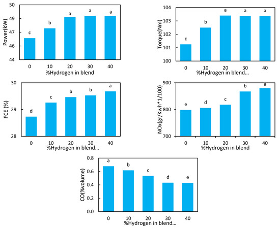 Figure 7 shows the comparison of the average engine performance parameters against the percentage of hydrogen fuel by Tukey method at the level of 5%. As determined, by increasing the percentage of hydrogen up to 20%, the changes in power and torque trend significantly upward, but after that the changes remain nearly constant. Increasing the percentage of hydrogen generates a significant increase in FCE. The early increase of pressure inside the combustion chamber is due to the high speed of hydrogen reaction, which has reduced the amount of power and also reduced the engine torque when the hydrogen amount is more than 30%. This reduces in cylinder pressure on the piston in the expansion cycle and ultimately reduces the engine power. The changes in NOx versus an increase in the percentage of hydrogen fuel trend significantly upward. In contrast, increasing the percentage of hydrogen significantly reduced the CO pollution. The high NOx emissions are due to the high temperature of the combustion chamber gases. Because increasing the percentage of hydrogen increases the temperature of the combustion chamber, it can be concluded that CO decreases. The maximum NOx and minimum CO in 40% hydrogen are obtained in the fuel composition. At the same time, according to the obtained values, improving the operating conditions of the engine as well as the exhaust pollutants proved that the amount of 30% hydrogen creates more suitable conditions in the engine. The alphabet of “a”, “b”, “c”, “d” and e show the difference between results in each figure.