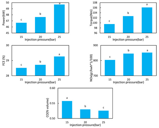 Figure 8 demonstrates the result of the average performance parameters of the engine versus fuel injection pressure (IP) compared by Tukey method at the level of 5%. By the increase of IP, power, torque, and specific fuel consumption the results show a significant upward trend. With the increase of IP, a significant reduction appears and generates advanced changes on the NOx and CO, respectively. By increasing the injection pressure, the fuel combustion efficiency increases and thus the engine performance increases. At the same time, the combustion temperature also increases. Therefore, NOx increases and the amount of CO decreases. As a general result, it can be considered that increasing the injection pressure improves the engine performance and also reduces the amount of CO output of the engine. The alphabet of “a”, “b”, and ”c” show the difference between results in each figure.