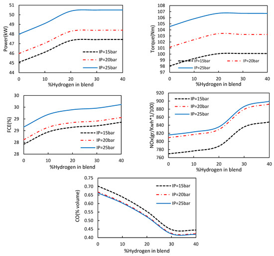 An increase in hydrogen to CNG in gasoline engines is responsible for decreasing exhaust emissions and improved engine performance [28,29,30]. Due to the switching of fuels from gasoline to CNG, the density ratio and injection pressure change accordingly. Subsequently this operation suffers from power loss and encounters drivability issues [31,32]; moreover, the procedure affects the CNG proportion prior to entering the combustion chamber. According to a study, the altering initial injection pressure and temperature influences the effects of the engine performance and results in exhaust gas [33,34].