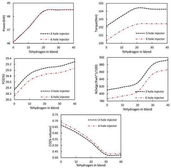 For survey and comparison, the effect of fuel blend at speeds of 2000, 3000, 4000, 5000, and 6000 RPM on engine performance and engine exhaust gas emissions of a factorial experimental design were used based on a completely randomized design. In this study, the hydrogen content in five levels includes 0, 10, 20, 30, and 40%, Injection pressure at three levels—15, 20, and 25 bars—and the injector holes number used had values of 3 and 6.