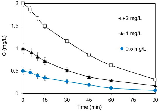 The effect of the initial ANZ concentration on its removal in 0.1 M Na2SO4 is shown in Figure 2. The kapp values of 0.022 and 0.0224 min−1 were computed for the removal of 0.5 and 1 mg L−1 of ANZ, respectively. From these almost equal kapp values, it is implied that the reaction indeed follows first-order kinetics at low ANZ concentrations, where the rate increases proportionately with the concentration of ANZ. At a concentration of 2 mg L−1, the rate also increases with concentration, although this is not proportionate. However, data can perfectly fit into Equation (2); thus, degradation follows pseudo-first-order kinetics at higher initial concentrations. Similar results have been reported for the electrochemical degradation of different emerging contaminants, such as ethyl paraben [17], ampicillin [24], and thiamethoxam [23]. For a constant current density, the number of ROS generated remains constant, and therefore, the kinetics is completely dependent on the concentration of ANZ and/or mass transfer. These results strongly suggest that the initial concentration of the organic pollutant plays a significant role in determining the degradation kinetics. It is necessary to work with environmentally relevant concentrations of ANZ to avoid the misrepresentation of the degradation kinetics.