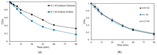 The effect of the type of electrolyte on the removal of 1 mg L−1 was studied using 0.1 M Na2SO4 or 0.1 M NaCl, and the results are shown in Figure 3a. The removal is favored in the presence of Na2SO4, with the respective kapp value of 0.0224 min−1 being nearly twice as much (0.0132 min−1) as that with NaCl. The formation of sulfate ROS, such as S2O8− and SO4−· ions, facilitates the removal of ANZ. Similar results have been reported for the degradation of florfenicol [29]. The role of chloride in the electrochemical removal of ANZ will be discussed in detail in Section 3.6. Furthermore, the effect of electrolyte concentrations on the ANZ is evaluated and shown in Figure 3b.