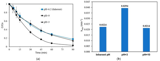 Experiments were performed with 1 mg L−1 of ANZ in 0.1 M Na2SO4 to assess the influence of pH in the range of 3–10 on ANZ degradation. There is no significant change when the initial pH increases from its inherent value of 6.2 to 10 (Figure 4). However, ANZ removal increases when the pH is reduced to acidic conditions, i.e., the respective kapp increases from 0.0224 to 0.0394 min−1 upon reducing pH from 6.2 to 3. The formation of ·OH radicals on the surface of the BDD electrode is typically favored in an acidic environment, and so is their oxidation potential. In a study on the degradation of tetracycline, kapp increased slightly upon decreasing the solution pH from 9 to 3 [32]. Many studies involving electrochemical oxidation over BDD have shown that the influence of pH within a range of 2–9 on the apparent rate constant values is not noteworthy [17,33,34].