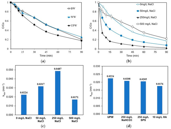 The effect of adding bicarbonate, sodium persulfate (SPS), or humic acid (HA) is shown in Figure 5d in terms of the respective apparent rates. Their impact is rather inconsiderable (although slightly negative) and can be explained as follows: in the presence of bicarbonate, carbonate radicals are formed as per Equations (8) and (9).