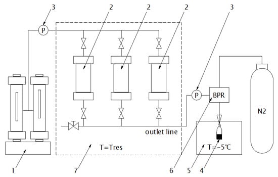Scheme of equipment for tracer testing under reservoir conditions in water-organic phases. 1. High-pressure plunger pump; 2. Piston cylinder (3 pcs.) for tracer solution in oil/water phases; 3. Pressure sensors; 4. Vial for effluent collection; 5. Cryostat (thermostat); 6. Backpressure regulator; 7. Thermo-regulated oven (heating up to reservoir temperature—Tres).