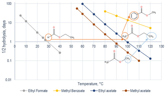 The reaction rate constants at other temperatures for the hydrolysis of some esters can be recalculated using the Arrhenius equation (Equation (6)):