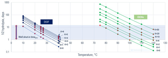 Analyzing the change in the 1/2 hydrolysis of the esters with different reaction rates, in Figure 3, the satisfying area of the applicability of an individual tracer can always be distinguished depending on the temperature of the reservoir at a minimum and maximum K-value. Figure 3 illustrates the effect of the K-value on the hydrolysis time, and the value of the 1/2 hydrolysis time that is required to achieve the same chosen temperature, albeit with a different K-value (depending on the type of oil, the K-value may vary). The example of the tracers of ethyl format and ethyl acetate, using Equation (8), shows how the reaction time changes with an increase in the K-value (Figure 3); here, the value of the residual oil saturation of 0.5 was used, and the value of 1 + β in this case was equal to 1 + K. Red dots in Figure 3 indicate the intervals for using these tracers if the well shut-in time does not exceed fifteen days (blue shade, Figure 3).