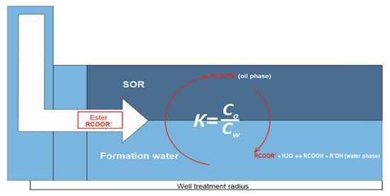 However, it should be remembered that, after the injection of ester in the aqueous phase into the formation together with the hydrolysis reaction, an extraction process takes place, i.e., the partitioning of ester between two immiscible phases (water, oil). The kinetics of ester hydrolysis in a two-phase system is considered similarly according to the pseudo-first order reaction with the rate constant k(2phase), which is 1 + β (β = K∙(Sor/1 − Sor)) times less than the reaction rate constant in a single-phase system k(1phase) [34]: