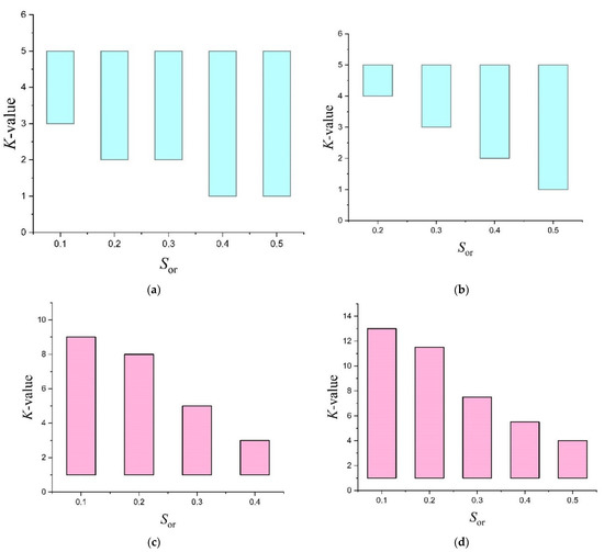 Range of K-values at different values of residual oil saturation Sor and formation water salinity, leading to the optimal well shut-in time for ethyl formate: (a) T = 35 °C; (b) T = 45 °C and ethyl acetate: (c) T = 70 °C; (d) T = 90 °C.