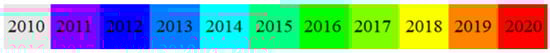 This article uses CiteSpace version 5.8 R3 to carry out quantitative data analysis. CiteSpace can scientifically identify the content of documents and visually process research trends, hot spots, and other information. Weizhang Liang et al. [] used CiteSpace software to conduct a scientific metrological review of hard rockburst research from 2000 to 2019. They systematically analyzed the research status of rockbursts and provided valuable and in-depth understanding in this field for researchers. Junzhi Zhang et al. [] used CiteSpace software to scientifically measure a large number of documents on the service life of reinforced concrete structures, described the retrieval strategy of data collection, and carried out an information visualization analysis. In order to realize the risk assessment of mine water, Liu Beizhan et al. [] used CiteSpace software to collate the relevant literature of the past 10 years, and analyzed the hot spots and frontier trends of mine water inrush research in China. They used the text files exported from the literature collection platform for scientific quantitative analysis. The colors shown in the figure also represent different meanings. As shown in Figure 2, the colors in the network diagram represent years. In addition, mathematical statistics and comprehensive scientific analysis are reflected in the figure according to the data. This includes “centrality”, which indicates the importance of nodes. When its value is greater than 0.1, it plays a core role in the network diagram.