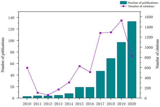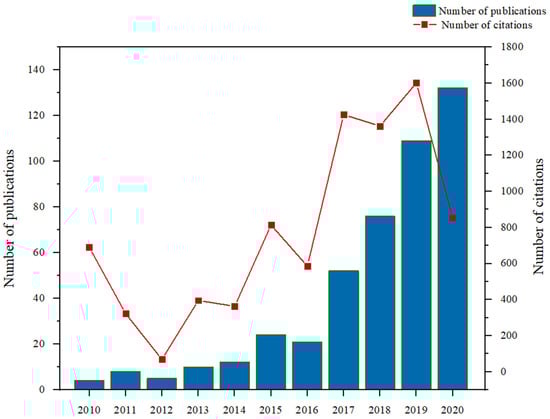 It can be seen from Figure 3 that the output of the relevant literature on the application of acoustic emission in coal in the world is on the rise. In 2010, He, MC, and other scholars studied the acoustic emission characteristics through the rockburst process of limestone under the condition of true triaxial unloading []. From 2010 to 2016, publications have changed slightly; obvious changes have taken place since 2016. It can also be seen from Table 1 that the total output of articles in the literature from 2010 to 2020 was 453; from 2016 to 2017, the number of documents increased from 21 to 52, and to 132 in 2020. Similarly, the number of citations to the literature increased greatly from 2016 to 2017, from 586 to 1425, a significant increase in the literature output. From 2017 to 2020, it has gradually entered the high-speed accumulation period of theoretical research results and practical exploration of acoustic emission in coal application. From the relative growth rate of the previous two years, it can be seen that the relative growth rate of publications has decreased, and the relative heat has also decreased in recent years from 2017 to 2020, though it still shows an increasing trend. The trend of the number of citations in Figure 3 and the increase in the published articles with the year indicate that the application of acoustic emission in coal is still a key research problem for scholars in various countries.