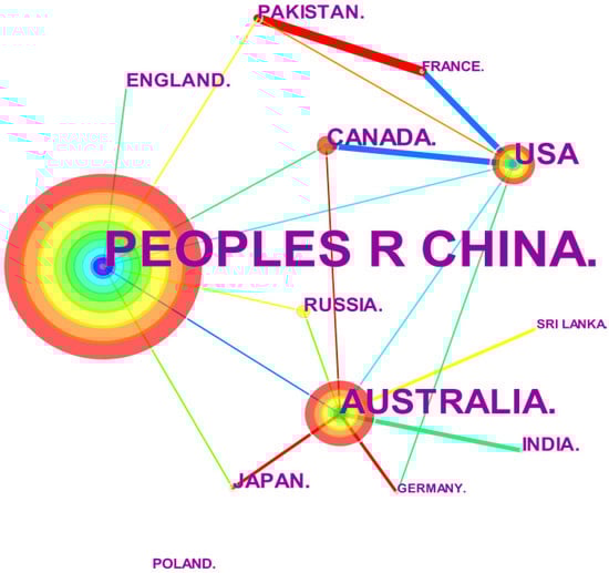 The following will be analyzed from the three cooperation networks of countries, institutions, and authors. The nodes in the cooperation analysis diagram represent the amount of documents issued by a country, institution, or author. An article can contain multiple authors or countries; when two different authors or countries appear in the same article, a connection will appear between the two nodes in order to indicate that there is a cooperative relationship between the two. The color of the line corresponds to the color of the figure, and also represents the year. The thickness of the line represents the cooperation intensity []. The size of the nodes in the graph represents the number of documents of a certain author, country, or institution. The size of the nodes is directly proportional to the number of documents. The color of nodes in different cooperation network graphs represents their active years.