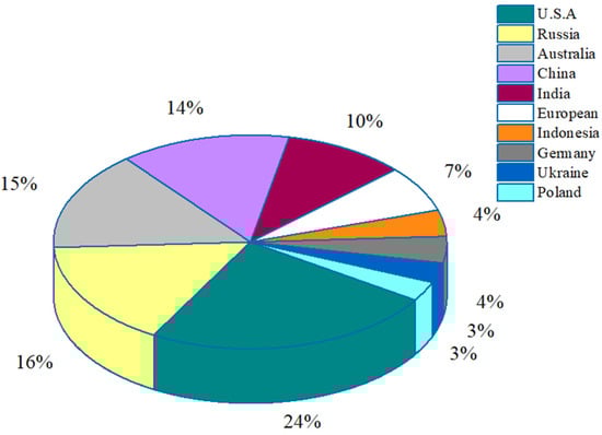 According to the analysis chart of the national cooperation network in Figure 5, China has the largest node, indicating that compared with other countries, the number of published documents is the highest. The top three countries are China, Australia, and the United States, and the betweenness centrality values are 0.72, 0.3, and 0.12, respectively. The data show that the number of papers published by Chinese, Australian, and American scholars are 398, 51, and 33, respectively. In the article by Zhang Li et al. [] on the comparison between the situation regarding China and the global coal industry in 2021, it is shown that by the end of 2019, the global coal reserves were 1069636Mt. The article data showed that the top ten countries in the global coal resource reserves were the United States, Russia, Australia, China, India, European Union, Indonesia, Germany, Ukraine, and Poland (Figure 6). Among them, the top five countries with resource reserves were the United States (249537Mt, accounting for 23.33% of the world’s total reserves), Russia (162166Mt, 15.16%), Australia (149079Mt, 13.94%), China (141595Mt, 13.24%), and India (105931Mt, 9.61%). The recoverable reserves of coal resources in the above five countries account for 75.57%, which is why the volume of publications is mainly concentrated in these countries.