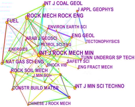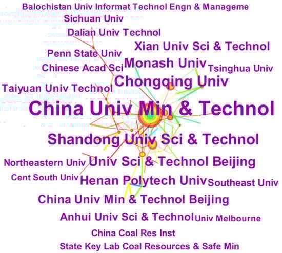 In the institution cooperation network (Figure 7) and the data, the top seven are China University of Mining and Technology, 168; Shandong University of Science and Technology, 44; Chongqing University, 42; Monash University, 28; Beijing University of Science and Technology, 27; Henan University of Technology, 24; and Xi’an University of Science and Technology, 18. China University of Mining and Technology is in a core position, with a centrality of 0.63. Mining and Engineering at China University of Mining and Technology is a national key discipline. It has very close cooperation with Central South University, Science and Technology University of Beijing, Xi’an University of Science and Technology, and other universities. It has two national key laboratories, one national engineering technology research center, and several key laboratories of the Ministry of Education. It has made very important contributions in the field of coal. For example, in the “12th Five-Year Plan” for scientific and technological development, it has studied the green mining technology of open-pit coal mines and developed domestic mobile crushers, electric wheel dump trucks, etc. In the manufacturing of sensing mine and coal mine equipment, the key technologies and equipment have been developed. In terms of clean coal and transformation in utilization, underground coal gasification technology has been studied. Secondly, the centrality of Chongqing University is 0.23, ranking second. Figure 7 shows that mainly Chinese institutions are included, which corresponds to the data obtained from the national cooperation network in Figure 5. From this, it is concluded that all institutions have made great contributions to the application field of acoustic emission in coal.
