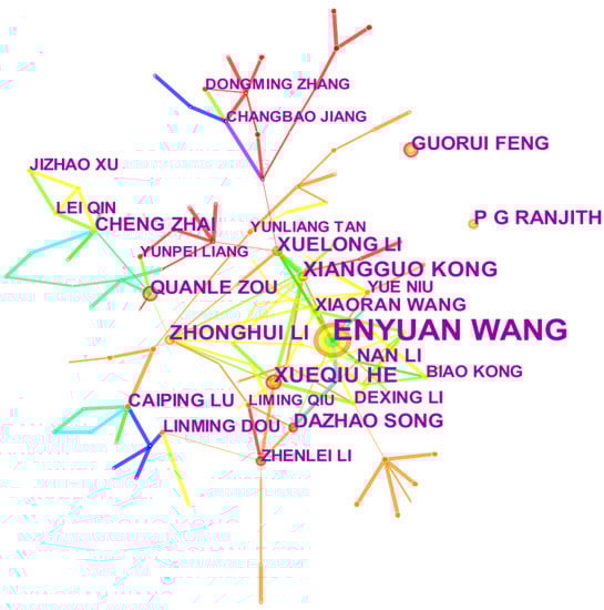 The cooperation network diagram of the authors shows the cooperation relationship of acoustic emission in the application of coal in the most detail. From Figure 8, it is obvious that Professor Yuan Wang is the author with the largest number of papers, with 40 papers. Seven scholars, including Wang Yuan, Kong Xiangguo, and Li Zhonghui, have published more than 10 papers. A total of 25 scholars have five or more articles, which shows that there is a high concentration of authors in the application field of acoustic emission in coal. Combined with Figure 7 and Figure 8, it is found that the institution of various scholars basically corresponds to the document-issuing institutions. For example, Professor Enyuan Wang teaches at the China University of Mining and Technology, mainly studying safety technology and engineering, as well as the prevention of mine gas and coal dynamic disasters (coal and gas outbursts, rockbursts). He jointly founded the electromagnetic radiation theory of coal damage and invented the acoustic and electrical monitoring for early warning technology of coal dynamic disasters. He put forward the mechanism of stress induced polarization (non-uniform variable-speed deformation of coal and rock) and electromagnetic radiation generated by the variable-speed movement of charged particles, invented the real-time monitoring and early warning technology of coal dynamic disasters, theoretically established the prediction criteria of coal and rock dynamic disasters, and invented the portable electromagnetic radiation monitor and the online electromagnetic radiation monitor for coal and gas outbursts. Professor Xiangguo Kong teaches at Xi’an University of Science and Technology, mainly studying coal and gas dynamic disasters, as well as geophysical signal response. He has strong cooperation with Professor Wang Enyuan of China University of Mining and Technology, and has published 37 articles in China’s HowNet system, which has a great influence in this field.