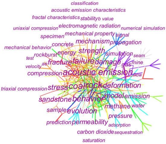 From 2010 to 2011, the proportion of keywords “coal”, “behavior”, and “rock” was extremely high, with frequencies of 111, 90, and 125, respectively. Median centrality was 0.21, 0.12, and 0.15, respectively, with “coal” as the first, which was greater than 0.1. In Figure 10, since the size of the node is proportional to the frequency of documents where the key words are located, the lowest frequency of the node in the figure is 12. In this period, there were almost no occurrences of the keywords “acoustic emission,” which indicates that scholars mainly continue to use traditional methods when studying the properties of coal. During this period, scholars mainly studied the failure mechanism of coal, which laid a theoretical foundation for the later application of acoustic emission technology. For example, in 2010, Zhao Yixin et al. [] analyzed the microstructure of coal samples by using a uniaxial cyclic loading test, thermal infrared radiation characteristics, X-ray CT, and scanning electron microscope SEM. Finally, they obtained the stress warning point easily in order to impact coal damage during the test. This is helpful to prevent damage to coal mines.