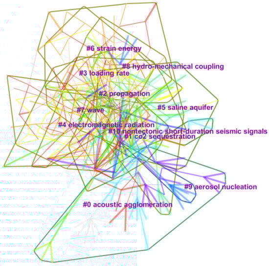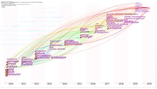 The main clusters with serial numbers 0 to 11 are selected in this study, as shown in Figure 11. They are the following: cluster #0 “acoustic aggregation”, cluster #1 “CO2 sequence”, cluster #2 “propagation”, cluster #3 “loading rate”, cluster #4 “electromagnetic radiation”, cluster #5 “saline aquifer”, cluster #6 “strain energy”, cluster #7 “wave”, cluster #8 “hydro mechanical coupling”, cluster #9 “aerosol nucleus”, cluster #10 “noninterstructural short duration seismic signals”. These 11 clusters contain most of the topics of the paper, and the regional unit slices of clusters are overlapped, indicating that these clusters are interrelated. It can be seen from the table that a parameter called silhouette score is located in the third column of the Table 4. Silhouette score is a parameter used to measure the quality of clustering performance, with a maximum of 1.00. It can be seen from Table 4 that the silhouette scores of the selected 11 clusters are not less than 0.80, indicating that these 11 clusters have a good matching degree with the main contents of the literature. The size in the second column represents the number of articles in the literature related to this cluster. The values for #0 “acoustic aggregation”, #1 “CO2 sequence”, and #2 “propagation” are 44, 44, and 43, respectively, which occupy an important position in this study. Obviously, the three in this cluster are the hot topics in the current field of research. “Acoustic aggregation” represents the aggregation of sound waves. The basic principle of acoustic emission technology is to convert the elastic waves generated by acoustic emission sources into electrical signals continuously and in real time. Next, electronic equipment is used to display the required characteristic parameters, so as to know the internal defects of materials, which corresponds to “acoustic aggregation”. Underground gas, coal dust explosion, and fire accidents are often encountered in the process of coal mining. The content of carbon dioxide in coal seams is high; sometimes coal and carbon dioxide outbursts occur. In a very short time, carbon dioxide is accompanied by a sudden and large amount of coal outbursts, which will produce a large amount of carbon dioxide, so #1 “CO2 sequestration” is also a hot topic. Additionally, #2 “propagation” means the propagation of sound waves when cracks occur in coal. Compared with other rocks, the internal cracks of coal are larger, and too-large cracks will affect the propagation of sound waves. Scholars study algorithms to meet the needs of accuracy, which is also a hot topic in this field. In the relevant research, scholars mostly focus on the uniaxial compression and triaxial compression tests of coal, in which the loading speed is the main consideration, so #3 “loading rate” is also a pertinent issue at present. Finally, #4 “electromagnetic radiation” of coal is a phenomenon of outward radiation of energy. When coal deformation and failure under load occurs, coal will release strain energy. Therefore, acoustic emission and electromagnetic radiation have a certain relationship, so this is also a hot topic in the current field.