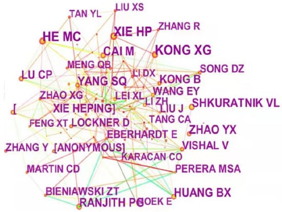 From the author’s analysis of the network diagram (Figure 12), the attention of famous scholars in this field can be obtained. It can be found that the nodes of He MC, Kong XG, and Xie HP have the largest font and are cited the most times. Academician He MC is mainly engaged in the research of deep rock mass mechanics and engineering disaster control. He reproduced the entire process of rockburst for the first time in the laboratory. He came to the conclusion that the rockburst strength depends on the compressive elastic properties of high stress rock mass, and the rockburst mode is controlled by the occurrence of a structural plane. His has been evaluated by the academic community as a long-term in-depth study of the front line of mine production. He committed to the research and practice of the theory and the technology of large deformation disaster control. Professor Kong Xiangguo mainly studies coal and rock gas dynamic disasters, coal fracture, and geophysical signal response, which has a great impact on this field. Academician Xie Heping has long been committed to basic research and engineering practice in the fields of mining engineering, mine engineering mechanics, utilization of green energy, and deep earth science. In the field of coal, he established the mathematical model of top coal fragmentation control by using the fractal method and the energy dissipation theory. He proposed and designed a set of “top coal weakening pre-blasting technical schemes.” This ensures the fragmentation requirements of top coal caving, improves the recovery rate, and makes the top coal caving technology successful under the condition of Datong hard coal. The citations of the three professors are 74, 70, and 66, respectively in Table 6. Professor He MC et al. [] used acoustic emission technology to study the crack evolution process of gas coal as early as 2010. Professor Kong XG et al. [] studied the critical slowing process of acoustic emission characteristics of methane-containing coal in 2015. It can also be seen in the table that other professors have made good achievements in this field, and the research results of scholars play a great reference role in this field.