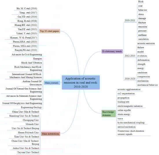 However, there is no systematic analysis focusing on specific areas of coal and acoustic emission. In this paper, CiteSpace is used to visually analyze the literature data of the application of acoustic emission in coal, so as to have a more comprehensive understanding of the research in this field by scholars at home and abroad. CiteSpace can make a quantitative analysis of the academic literature by using mathematical statistical methods, as well as scientific methods which are more accurate for co-occurrence or co-analysis. These remarkable features are widely used in various fields. CiteSpace is used to systematically analyze the literature related to acoustic emission and coal, according to the global publications from the core database of Web of Science from 2010 to 2020. It involves a series of angles, such as cooperation analysis, co-occurrence of keywords in the literature, and relevance for statistical analysis of the data, so as to determine the development process and future direction. This paper introduces the retrieval method and CiteSpace measurement software, then discusses the development process of acoustic emission in coal by using the scientific econometric analysis method. It also involves global publication output analysis, cooperation analysis, keyword analysis and clustering in China, and, finally, a summary of the important conclusions.