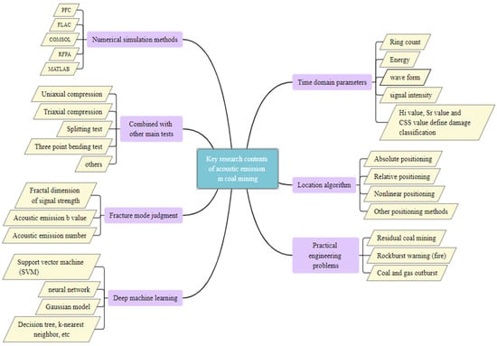 The period from 2016 to 2020 was the mature stage of acoustic emission technology. Acoustic emission technology was not only applied to coal; scholars began to compare coal with other materials. For example, Chen, Lei et al. [] used acoustic emission technology to study the compression deformation characteristics of siltstone under different water contents in 2017. Scholars discussed the relationship between the acoustic emission characteristics and the growth and expansion of siltstone fractures, and obtained the relationship between the water content of the specimen and the compressive strength and elastic modulus. They divided the deformation stages of the specimen and obtained certain rules. Chong, Zhaohui et al. [] used numerical simulation to study acoustic emission events of argillaceous sandstone under confining pressure in 2017. They used the DEMAE model to calculate the scalar seismic tensor of particles in motion, and to further determine the magnitude of acoustic emission events. An algorithm for identifying the same space-time AE events is proposed, and the model is verified, which provides a research basis for preventing earthquake disasters caused by coal mining. Various scholars have made great contributions to the research of acoustic emission in different periods.