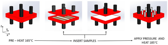 Post-processing consisted of two stages, i.e., remelting and compaction of the material and is pictured in Figure 1. Ordinary salt (average particle size 45 μm ± 5 μm) was first pre-heated in an aluminum box (size 200 mm × 120 mm) at 165 °C. Next, the samples were placed over the free surface, paying attention to ensure that the surface was as planar as possible to avoid sample distortion. Then, the samples were completely covered by salt, and the box was closed with an aluminum lid that could move vertically. The whole box was heated up to 185 °C, i.e., 30 °C above the melting temperature. A pressure of 10 bar was applied on the moving lid. At all times, the temperature was monitored by a K thermocouple placed inside the box close to the samples. Temperature was maintained for 5 min, and once the heating was turned off, the samples were extracted when the temperature read by the thermocouple was 60 °C. The whole procedure lasted about 1 h in all cases. All the surfaces of the samples were finally cleaned of salt using fine sandpaper.