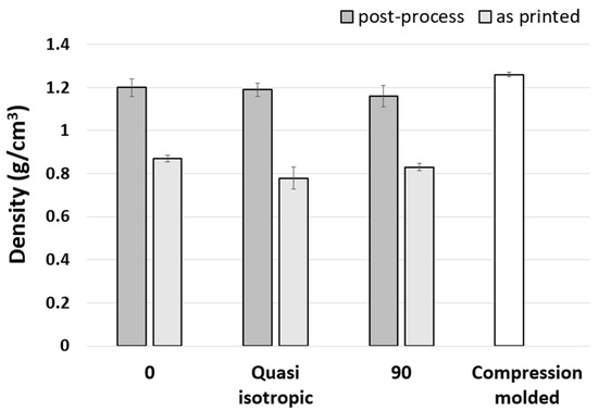 The density values are reported in Figure 2. As can be seen, there was a remarkable density increase from the as-printed specimens to the post-processed ones. In fact, after the post-processing treatment, the density reached almost the same value as the compression-molded specimens, i.e., 1.26 g/cm3. This gave evidence that most of the porosity was eliminated by the post-processing procedure.