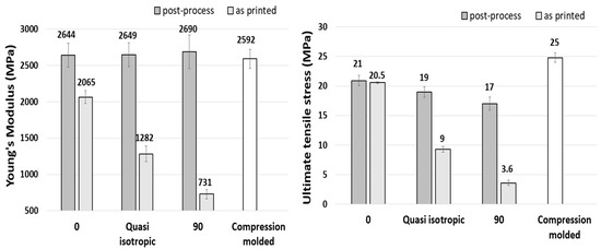 Young’s modulus and ultimate tensile stress of each laminate, both post-processed and as-printed, and compression-molded samples. The error bars represent the standard deviation.