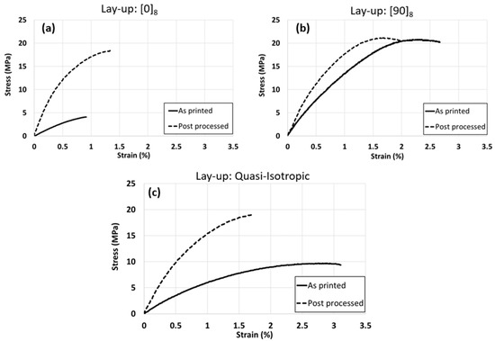Tensile test comparison between post-processed and as-printed of the lay-ups: (a) unidirectional 0°; (b) unidirectional 90°; and (c) quasi-isotropic.