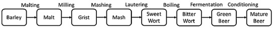 Block flow diagram illustrating material states and stages of a beer manufacturing process [20].