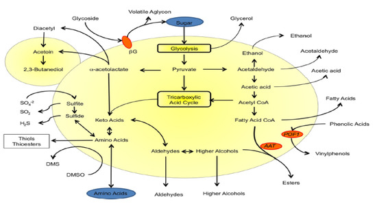 The reaction is overall exothermic, as clearly denoted by the negative sign of reaction enthalpy. Equation (1) is a clear simplification that does not portray the complex phenomena during the fermentation process: these are distinguished into metabolic (intracellular) and non-metabolic (extracellular) [13]. Figure 2 presents a high-level overview of significant metabolic phenomena during beer fermentation.