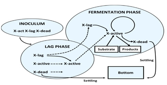 The de Andrés-Toro et al. model considers five state variables: sugar concentration (CS), ethanol concentration (CE), total suspended biomass concentration (XS), ethyl acetate concentration (CEA), and diacetyl concentration (CDY) [41]. The total biomass in a fermentation system comprises three entities, active (XA), latent/lag (XL), and dead (XD) biomass, without conservation constraints. Parameters were estimated from concentration trajectories obtained via several isothermal experiments performed at T = 8, 12, 16, 20, and 24 °C, using wort and yeast from Cruzcampo Breweries (Madrid, Spain) [41,42]. Beer fermentation is therein divided in two consecutive (lag and actual fermentation) phases. At the onset of brewing, there is no fermentation. During the lag phase, only dead cell settling and lag cell activation occurs: once the latter reaches 80%, both cell growth and fermentation commence. Thereafter, all four phenomena (settling, activation, growth, and fermentation) occur simultaneously until completion, followed by dilution, fresh (‘green’) beer maturation, and final packaging (Figure 3).
