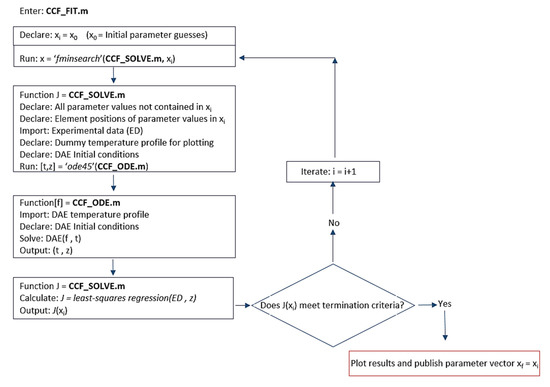 The de Andrés-Toro et al. model [41] is implemented in the MATLAB (R2018b) environment and integrated numerically via ode45: the code comprises 13 (11 differential and 1 algebraic) equations, one of which inputs the temperature profile to Arrhenius-type parameter definitions, Equation (23), at each time point. Initial conditions with source (or calculation method) are provided in Table 3.