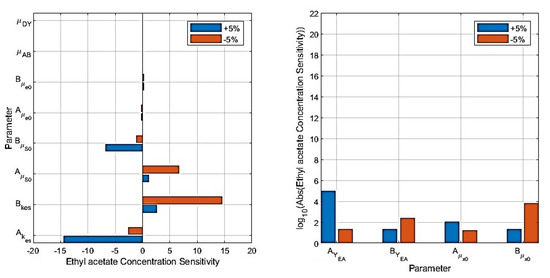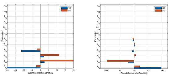 A sensitivity analysis indicates that parameters Akes and Bkes are the strongest influencers of response variation, due to the great importance of sugar, ethanol, and biomass in model dynamics. Ethyl acetate is the most sensitive response vs. parameter variations, confirming that ester expression is an indispensable LAB/AFB process control target, given its dominance on fruitiness perception.