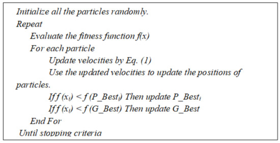 The algorithm follows a global best value to indicate which particle data are closest to the target and the cutoff value to indicate when the algorithm ends. Depending on how far the particle’s position is from the target, a velocity value is deliberated by Equation (1) in the standard PSO algorithm [8]: