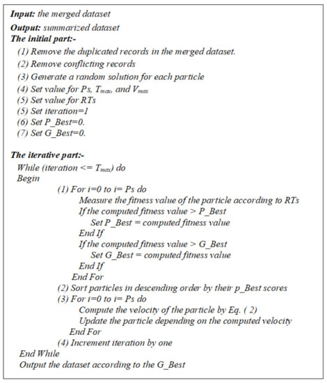 After that, the dataset summarization is performed by the proposed PSO, as shown in Figure 3. The representation of particles is as follows. The length of the particle is equal to the number of records since the particle is considered to be binary; that is, each cell in the particle is either one or zero. A value of one indicates that a record will be present in the dataset, and zero indicates that this record will not exist.