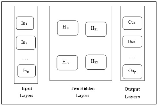 An ANN is similar to human brain behavior in that it acquires knowledge by training and stores this knowledge using connecting forces within neurons called synaptic weights. There is also a vital neuronal similarity, providing biologists with the opportunity to rely on ANN to understand the evolution of biological phenomena [16]. Just as humans have senses that act as input units that connect them to the outside world, neural networks need input units and processing units. The input units create a layer called the input layer, and the processing units form the processing layer, which produces the output of the network. Between each of these layers, there is a layer of interconnections that links each layer with the next layer [7]. In the interconnections layer, the weights of each interface are set. The network contains only one layer of input units, but it may contain more than one layer of processing layers. In the processing layers, calculations are performed by adjusting weights, and by using them, we obtain the appropriate reaction for each instance of the input in the network [17]. The weights represent the basic information that the network will learn. Weights need to be updated during the training phase, and many different algorithms are used for this update process depending on the type of network [18]. One of the most important of these algorithms is the back propagation algorithm, which is used in training fully interconnected, forward-fed, multi-layered, and nonlinear neural networks. This algorithm is considered as a generalization of the error correction pattern-training method. Moreover, this algorithm is implemented through two main stages: