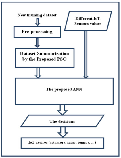This case study has been applied only to the type of Picual olive tree that is also known as Marteña or Lopereña. This type was chosen because it contains high oils. Picual olive trees represent 25% of the world’s total olive oil production. Figure 6 outlines the main operations in smart olive cultivation by the proposed adaptive PSO-ANN and IoT. If there is a new incoming training dataset, it is firstly pre-processed and summarized.