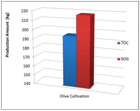 The following results are the first signs of cultivated seedlings. The production amount of the olive fruit (harvest of the olive fruit) of the proposed smart olive greenhouse (SOG) using ANN and IoT and the Traditional Olive Cultivation (TOC) is shown in Figure 7.