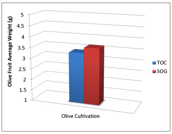 The average weight of the olive fruit from the SOG and TOC is presented in Figure 8. One hundred olives were randomly assigned from SOG and TOC separately for mean olive weight measurements. They were weighed and divided by their number. This process was repeated several times, and the results were averaged and documented in Figure 8. The average longitudinal diameter and cross diameter of SOG and TOC are viewed in Figure 9. Ten olives were randomly selected to measure the average longitudinal diameter. The longitudinal diameter of each fruit was measured, and the average results were taken. This process was performed separately for SOG and TOC methods.