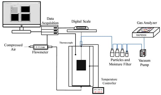 The weight measurement of the sample was carried out by using a perforated cylindrical basket of 60 mm in diameter and 50 mm in height inside the reactor, suspended from the digital scale by a stainless-steel wire of 2 mm in diameter. Consequently, as there were three different devices, a data acquisition and monitoring program was developed using LabVIEW software to centralize the information of the different parameters and to be able to record the data throughout the experiments. Consequently, the LabVIEW program continuously recorded the weight, air flow rate, and temperature. In addition to these devices, a portable gas analyzer, Rapidox 5100 model, was used to measure the main gas compounds (CO2, CO, H2, and CH4) released during the experiment. All the gases have a ±1% full scale accuracy and a 0.1% resolution. The collection and analysis of the gas samples were only possible through the utilization of a vacuum pump and a particle and moisture filter.