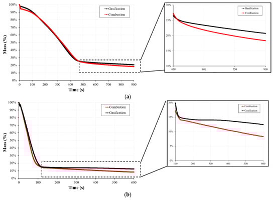 Mass loss curves considering the gasification and combustion regime at: (a) 400 °C and (b) 800 °C.