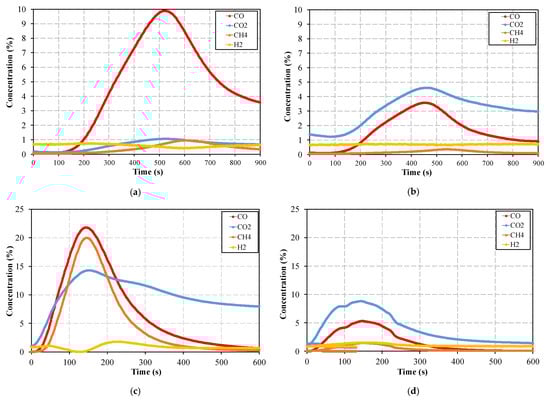 Gas emissions at different reactor temperatures and conversion conditions: (a) gasification at 400 °C, (b) combustion at 400 °C, (c) gasification at 800 °C, (d) combustion at 800 °C.