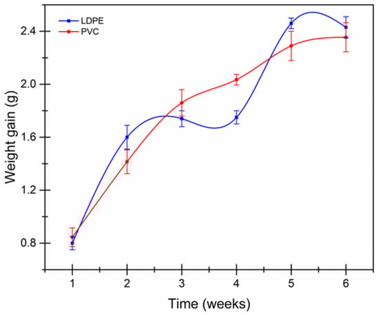 The diffusion of water vapor through a container gives an estimate of the strength of the polymer, as a difference in partial pressures is generated in the structure of the container. Figure 1 shows that in PVC film, because a slower increase was observed for PVC film from three to four weeks, the polar character of the Cl- increases the weight of the capsules containing the desiccant, thus proving to have a lower surface resistance. It can be established that there is a counter diffusion in the LDPE film when the vapor begins to permeate [27,28], causing the relative humidity to be higher now inside the device, which can be observed from the second to the fourth weeks and in the fifth week of the permeance study in Figure 1.